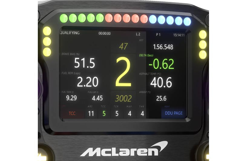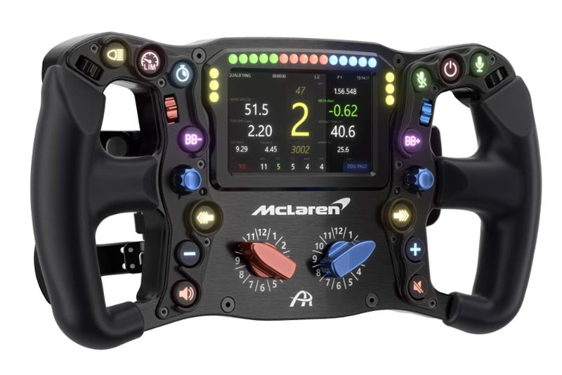 Steering wheel for racing simulators with realistic feel and size. Tactile pushbuttons with noticeable feedback and RGB lighting. Official McLaren Artura GT4 steering wheel. Magnetic paddle shifters for fast gear changes. Programmable buttons.