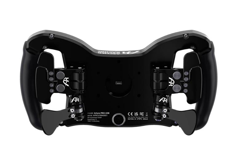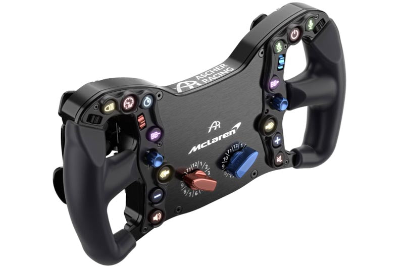 The Ascher Racing McLaren Artura Sport steering wheel is available in both SC (Wireless) and USB versions to guarantee ultimate compatibility. The platform-independent USB connection or Simucube wireless technology offer versatile connectivity options. Featuring high-quality components, 14 RGB-illuminated push buttons, four thumb encoders, two multifunctional seven-way joysticks, and two 12-position rotary switches, this steering wheel delivers a comprehensive set of features for an immersive sim racing experience.