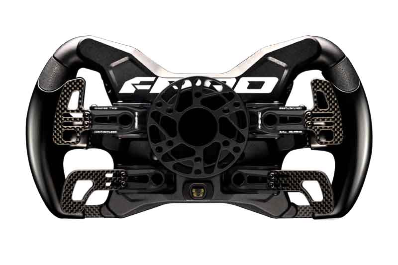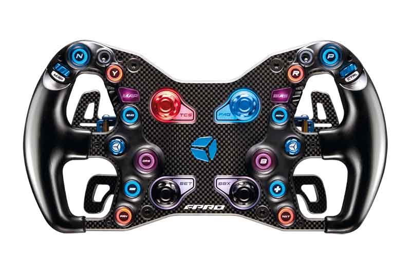 Discover our Cube Controls F-PRO. This updated Formula steering wheel features a USB+Bluetooth dual-mode connection and fully customizable RGB-backlit buttons, giving you an unprecedented level of freedom. It's equipped with a dual joystick, magnetic connectors, custom-designed magnetic switchless paddle shifters with adjustable travel, ball bearings, and enhanced tactile feedback. The front plate is made of 100% carbon fiber, and the main body is die-cast aluminum.