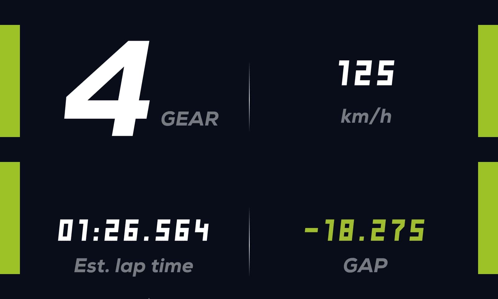More than ten key competition data parameters can be displayed such as speed, rpm, gear position, current lap speed, the gap to the fastest lap, tire temperature, fuel quantity, and more.