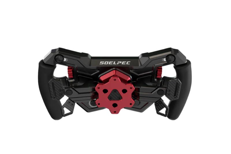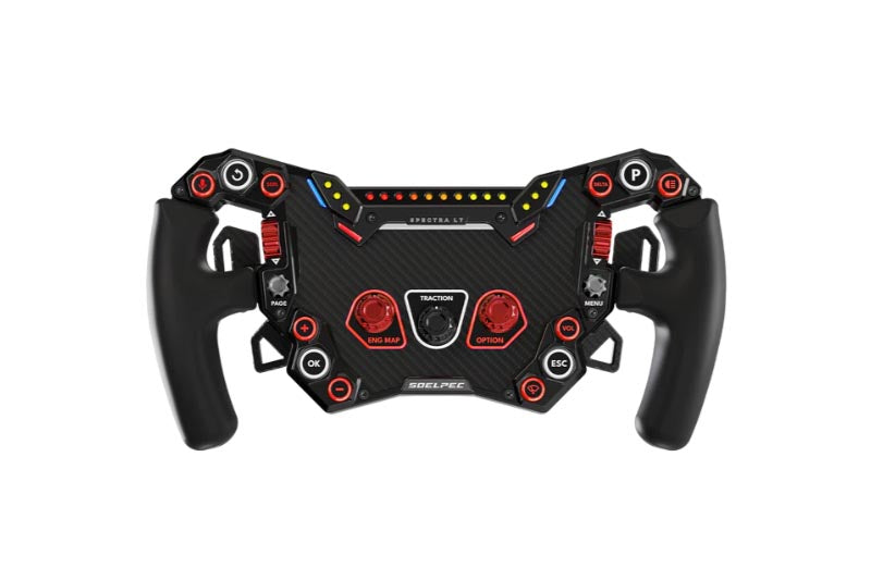 SPECIFICATIONS: Steering wheel diameter: 302 mm 17 pushbuttons with 700 gf tactile switches 2 7-way Funky switches 3 ELMA central rotary encoders with pushbuttons 2 double-acting ELMA thumb encoders with 8 inputs Fully customizable RGB lighting Total weight of 1200 grams Silicone handles with 50A cast coating Structure made of anodized 6061 aluminum Carbon fiber center plate PMMA keycaps and PMMA LED diffusers Textured PVC film stickers Cams made of carbon fiber. Magnetic ball bearing cams with black N52 magnets Double ball-bearing clutch cams with Hall sensors Special button for adjusting the clutch engagement point. What's included? Spectra LT steering wheel with dual clutch and carbon fiber camshaft Color-matched 42 mm spacer at the rear 4-pin spiral cable with Lumberg connector Additional sheet of polyester film stickers for key covers and transmitters Additional magnets for adjusting the switching force 6 M5*8mm screws for assembly 4 mm Allen key and pliers SOELPEC sticker sheet Quick Start Guide