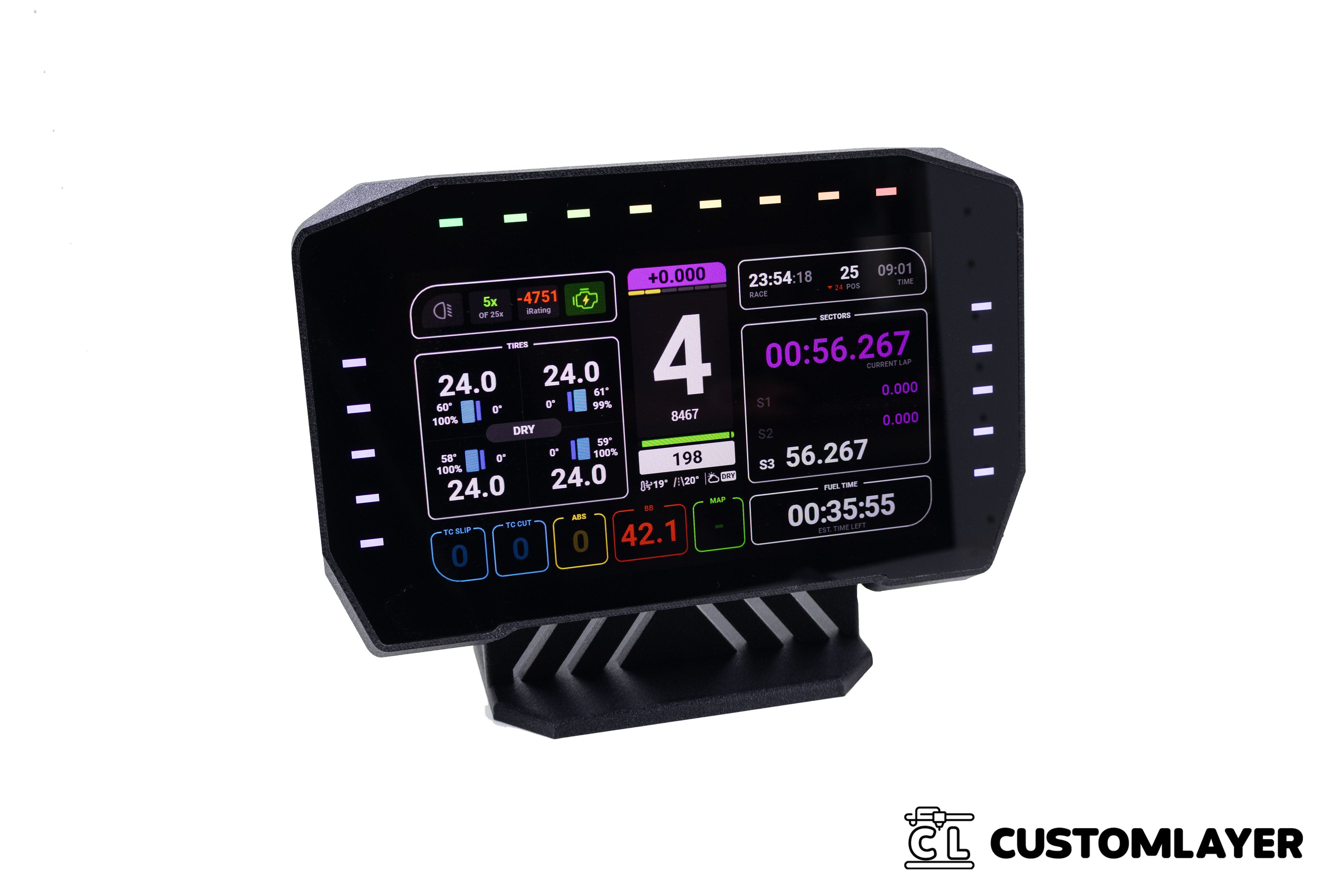 Im Inneren arbeitet unsere eigens entwickelte LED-Platine, die um das Display herum saubere, gleichmäßige Signale ausgibt – ideal für Warnhinweise, Flaggen oder wichtige Telemetrie. Die Front besteht aus einem klaren Glaspanel, das dem Display ein ruhiges, hochwertiges Erscheinungsbild gibt und gleichzeitig als Schutz dient. Das gesamte Modul sitzt in einem maßgeschneiderten 3D-Druckgehäuse, das Technik und Optik sauber zusammenführt.